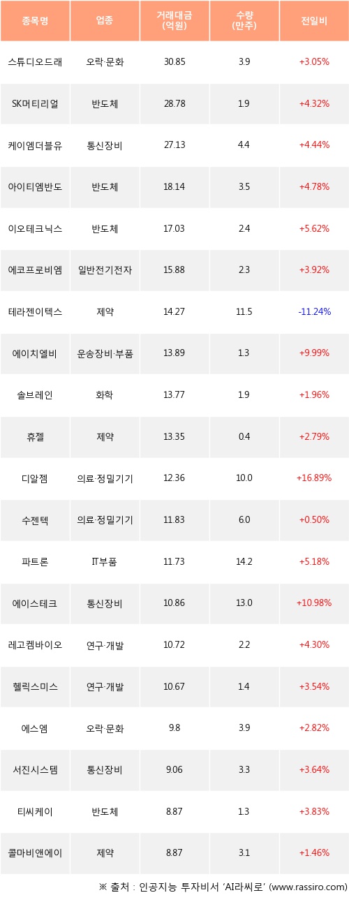 스튜디오드래곤, SK머티리얼즈, 케이엠더블유 등은 전일 대비 주가가 상승했고, 테라젠이텍스 등은 주가가 하락했다.