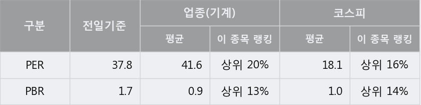 전일 종가를 기준으로 이 종목의 PER는 37.8배, PBR은 1.7배이다. PER는 기계업종의 평균 PER 41.6배 대비 -3.8배 낮은 수준으로 업종 내에서 상위 20%에 있고, PBR은 기계업종의 평균 PBR 0.9배 대비 +0.8배 높은 수준으로 업종 내에서 상위 13%에 위치한다.