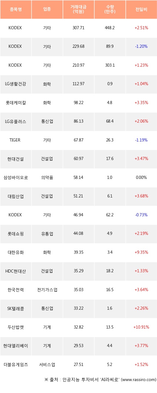 KODEX 200선물인버스2X, KODEX 인버스, LG생활건강 등은 전일 대비 주가가 상승했고, KODEX 200, TIGER 200, KODEX 코스닥150 레버리지 등은 주가가 하락했다.