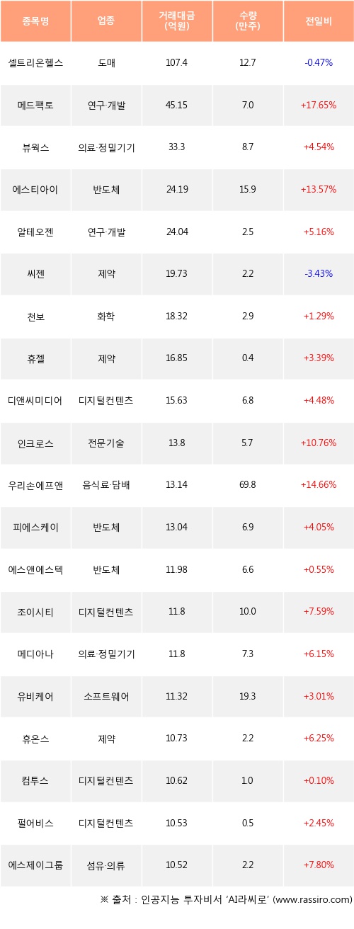 메드팩토, 뷰웍스, 에스티아이 등은 전일 대비 주가가 상승했고, 셀트리온헬스케어, 씨젠 등은 주가가 하락했다.