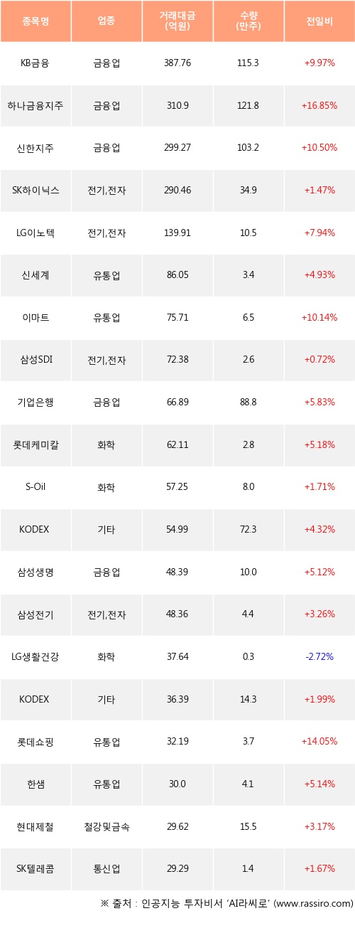 외국인 투자자의 순매수 상위 20개 종목은 KB금융, 하나금융지주, 신한지주, SK하이닉스, LG이노텍, 신세계, 이마트, 삼성SDI, 기업은행, 롯데케미칼등이다.