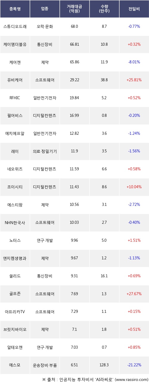 기관 투자자의 순매도 상위 20개 종목은 스튜디오드래곤, 케이엠더블유, 케어젠, 유비케어, RFHIC, 펄어비스, 에치에프알, 레이, 네오위즈, 조이시티등이다.