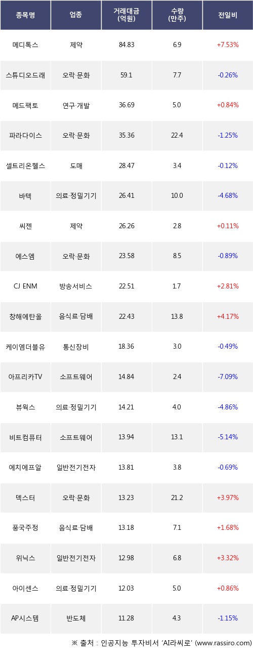 메디톡스, 메드팩토, 씨젠 등은 전일 대비 주가가 상승했고, 스튜디오드래곤, 파라다이스, 셀트리온헬스케어 등은 주가가 하락했다.
