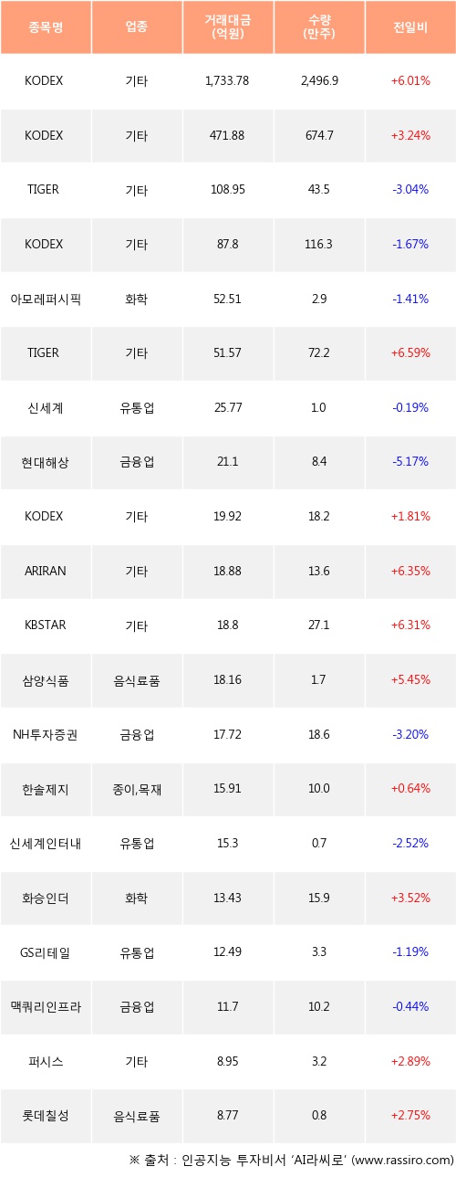 KODEX 200선물인버스2X, KODEX 인버스, TIGER 200선물인버스2X 등은 전일 대비 주가가 상승했고, TIGER 200, KODEX 코스닥150 레버리지, 아모레퍼시픽 등은 주가가 하락했다.