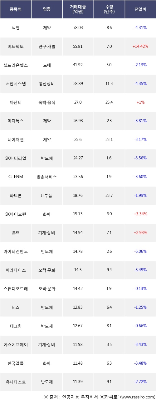 외국인 투자자의 순매도 상위 20개 종목은 씨젠, 메드팩토, 셀트리온헬스케어, 서진시스템, 아난티, 메디톡스, 네이처셀, SK머티리얼즈, CJ ENM, 파트론등이다.