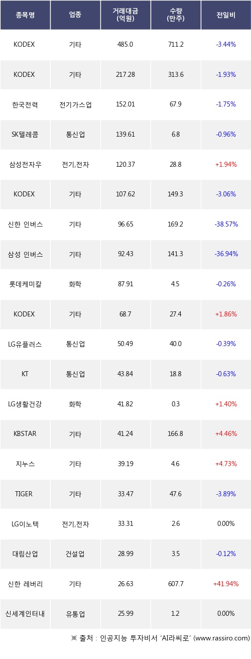 삼성전자우, KODEX 200, LG생활건강 등은 전일 대비 주가가 상승했고, KODEX 200선물인버스2X, KODEX 인버스, 한국전력 등은 주가가 하락했다.