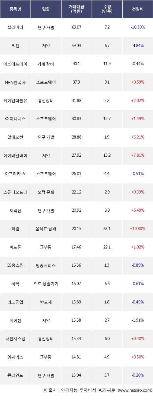 외국인 투자자의 순매도 상위 20개 종목은 셀리버리, 씨젠, 에스에프에이, NHN한국사이버결제, 케이엠더블유, KG이니시스, 알테오젠, 에이비엘바이오, 아프리카TV, 스튜디오드래곤등이다.