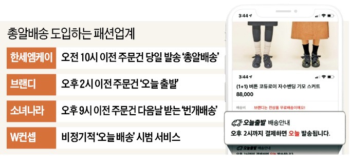 소녀나라도 서울 구로에 5950㎡(약 1800평) 규모의 물류센터를 갖추고 전체 과정의 80%를 자동화 시스템으로 처리하고 있다. 패션업계에서는 코로나19로 온라인 쇼핑을 즐기는 연령대가 확장됐고 그에 맞춰 빠른 배송 서비스도 늘어날 것으로 보고 있다. 패션 전문 쇼핑몰 ‘W컨셉’은 지난해 프로모션 차원에서 ‘오늘 배송’ 서비스를 시범 도입했다. W컨셉 관계자는 “물류센터가 안정적으로 가동될 수 있을 때만 서비스 차원에서 오늘 배송을 시행해보고 있다”며 “소비자 반응이 좋으면 앞으로 더 확대할 계획도 있다”고 말했다.
