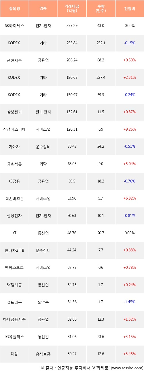 기관 투자자의 순매수 상위 20개 종목은 SK하이닉스, KODEX 레버리지, 신한지주, KODEX 코스닥150 레버리지, KODEX 200, 삼성전기, 삼성에스디에스, 기아차, 금호석유, KB금융등이다.