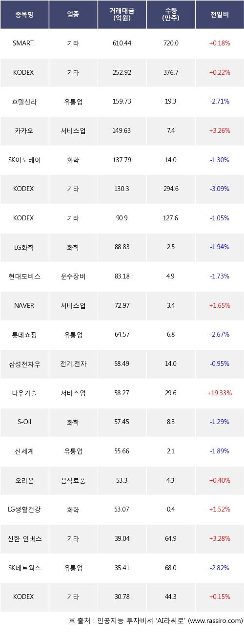 SMART 200TR, KODEX 200선물인버스2X, 카카오 등은 전일 대비 주가가 상승했고, 호텔신라, SK이노베이션, KODEX WTI원유선물(H) 등은 주가가 하락했다.