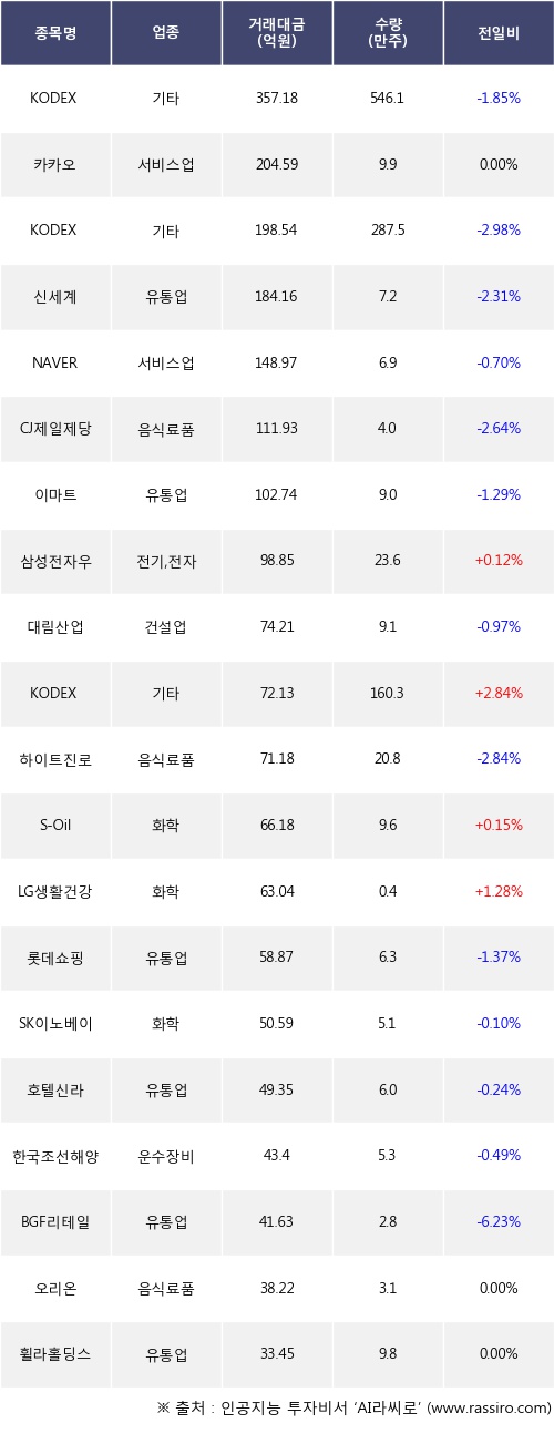 기관 투자자의 순매도 상위 20개 종목은 KODEX 200선물인버스2X, 카카오, KODEX 코스닥150선물인버스, 신세계, NAVER, CJ제일제당, 이마트, 삼성전자우, 대림산업, KODEX WTI원유선물(H)등이다.