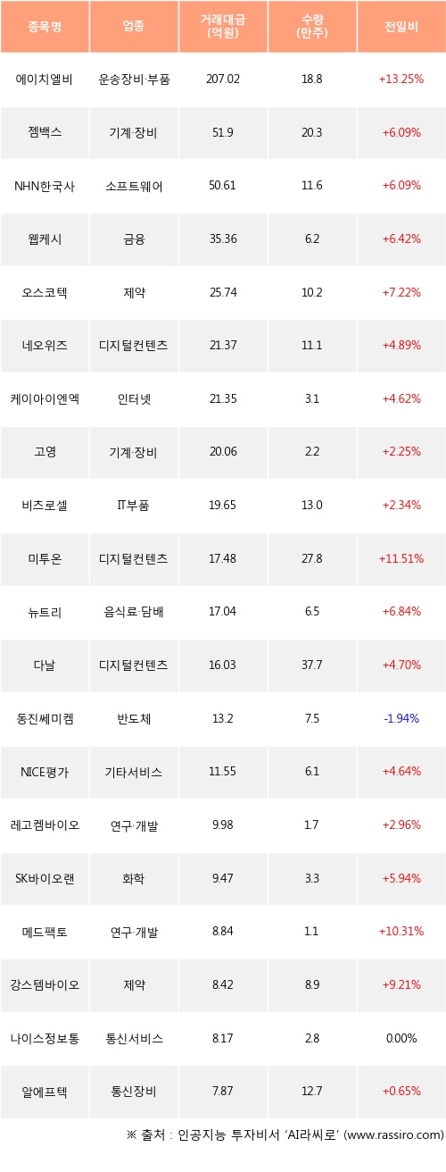 에이치엘비, 젬백스, NHN한국사이버결제 등은 전일 대비 주가가 상승했고, 동진쎄미켐 등은 주가가 하락했다.