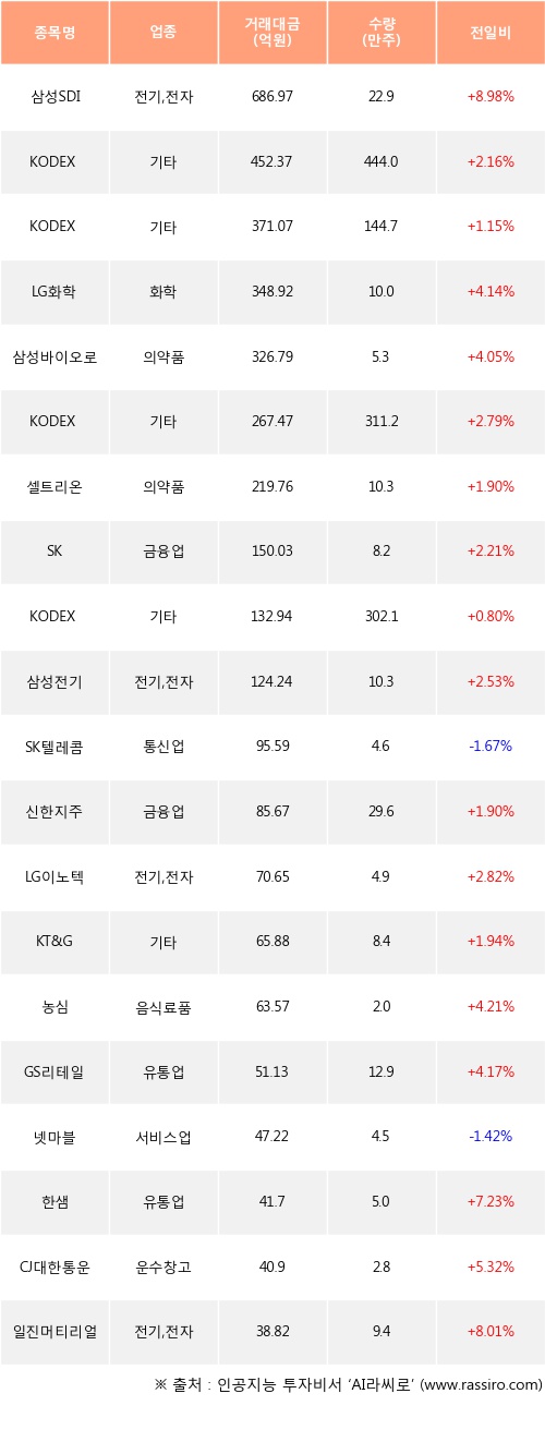 삼성SDI, KODEX 레버리지, KODEX 200 등은 전일 대비 주가가 상승했고, SK텔레콤, 넷마블 등은 주가가 하락했다.