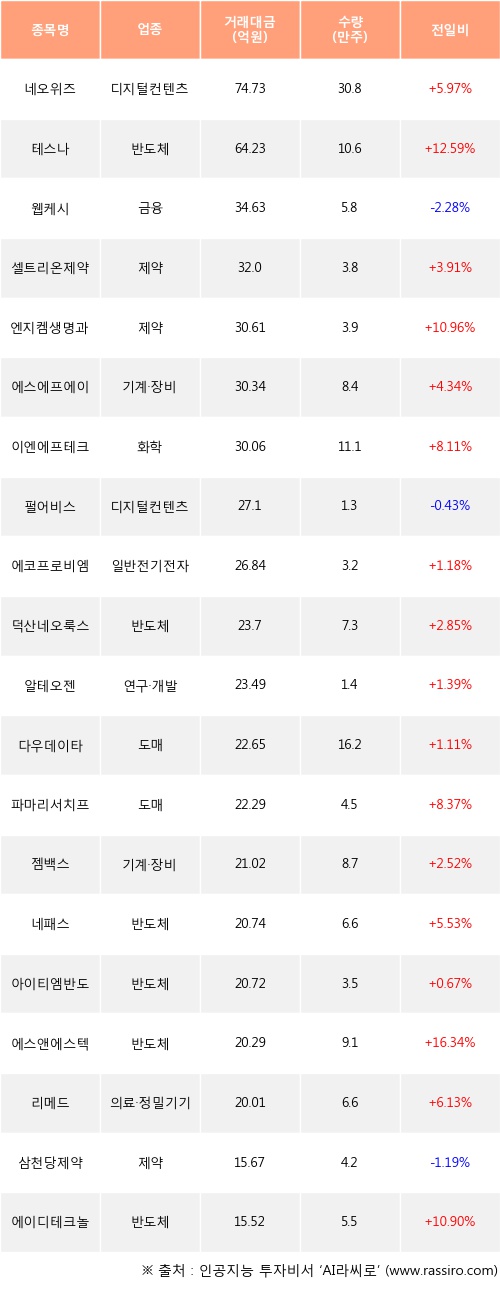 외국인 투자자의 순매수 상위 20개 종목은 네오위즈, 테스나, 웹케시, 셀트리온제약, 엔지켐생명과학, 에스에프에이, 이엔에프테크놀로지, 펄어비스, 에코프로비엠, 덕산네오룩스등이다.