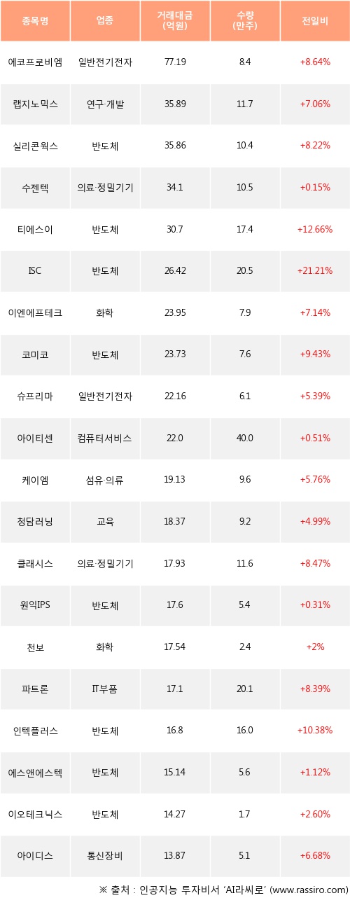 기관 투자자의 순매수 상위 20개 종목은 에코프로비엠, 랩지노믹스, 실리콘웍스, 수젠텍, 티에스이, ISC, 이엔에프테크놀로지, 코미코, 슈프리마, 아이티센등이다.