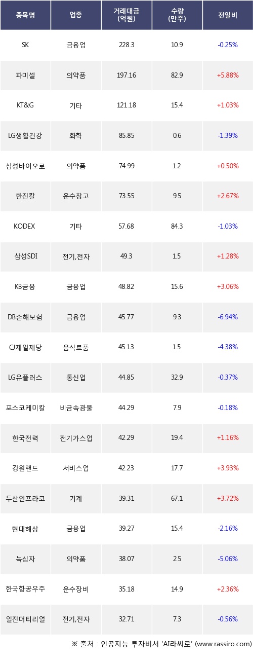 외국인 투자자의 순매도 상위 20개 종목은 SK, 파미셀, KT&G, LG생활건강, 삼성바이오로직스, 한진칼, KODEX 코스닥150선물인버스, 삼성SDI, KB금융, DB손해보험등이다.
