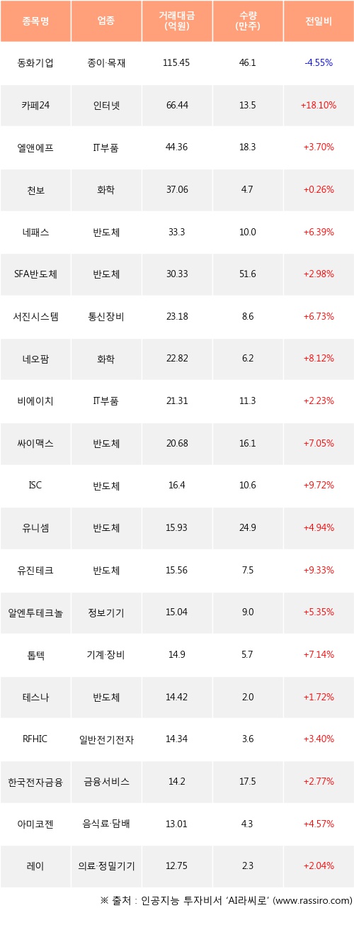 기관 투자자의 순매수 상위 20개 종목은 동화기업, 카페24, 엘앤에프, 천보, 네패스, SFA반도체, 서진시스템, 네오팜, 비에이치, 싸이맥스등이다.
