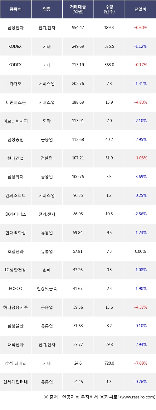 삼성전자, KODEX 200선물인버스2X, 더존비즈온 등은 전일 대비 주가가 상승했고, KODEX 코스닥150선물인버스, 카카오, 아모레퍼시픽 등은 주가가 하락했다.