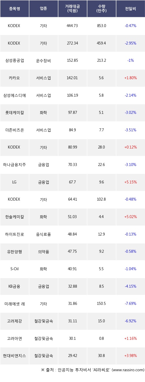 카카오, KODEX 200, LG 등은 전일 대비 주가가 상승했고, KODEX 200선물인버스2X, KODEX WTI원유선물(H), 삼성중공업 등은 주가가 하락했다.