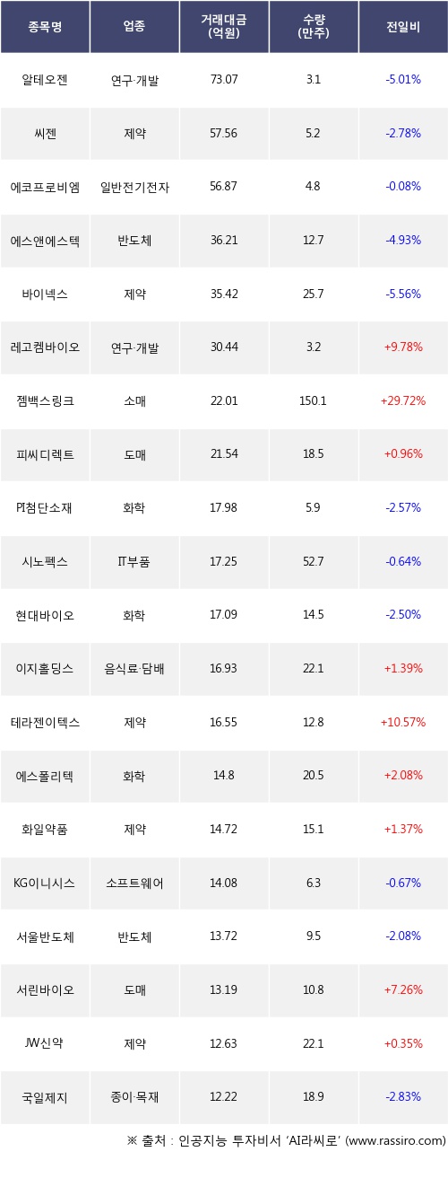 레고켐바이오, 젬백스링크, 피씨디렉트 등은 전일 대비 주가가 상승했고, 알테오젠, 씨젠, 에코프로비엠 등은 주가가 하락했다.
