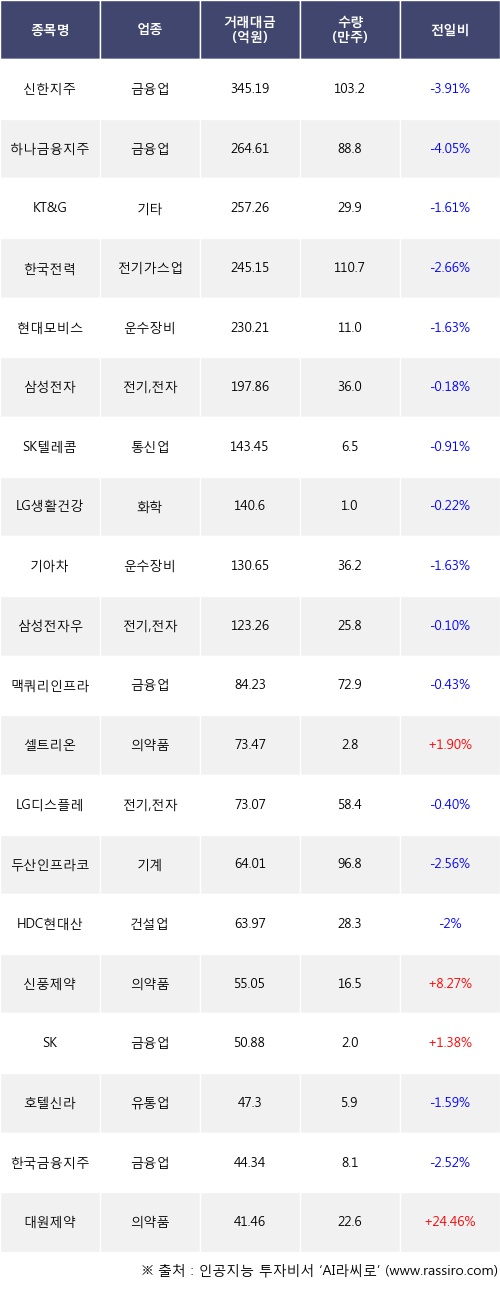 셀트리온, 신풍제약, SK 등은 전일 대비 주가가 상승했고, 신한지주, 하나금융지주, KT&G 등은 주가가 하락했다.