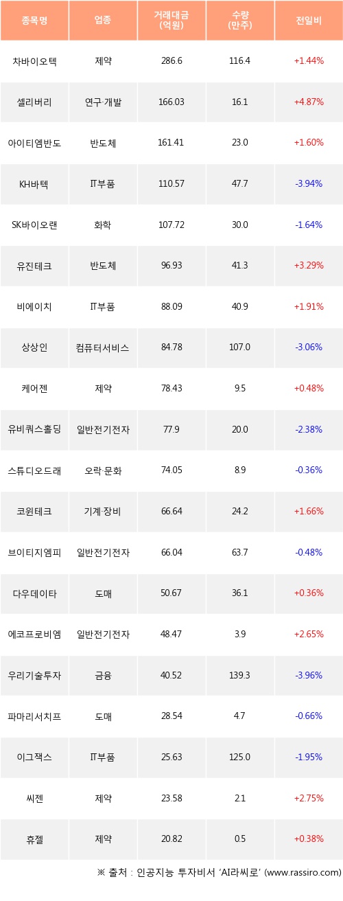 차바이오텍, 셀리버리, 아이티엠반도체 등은 전일 대비 주가가 상승했고, KH바텍, SK바이오랜드, 상상인 등은 주가가 하락했다.
