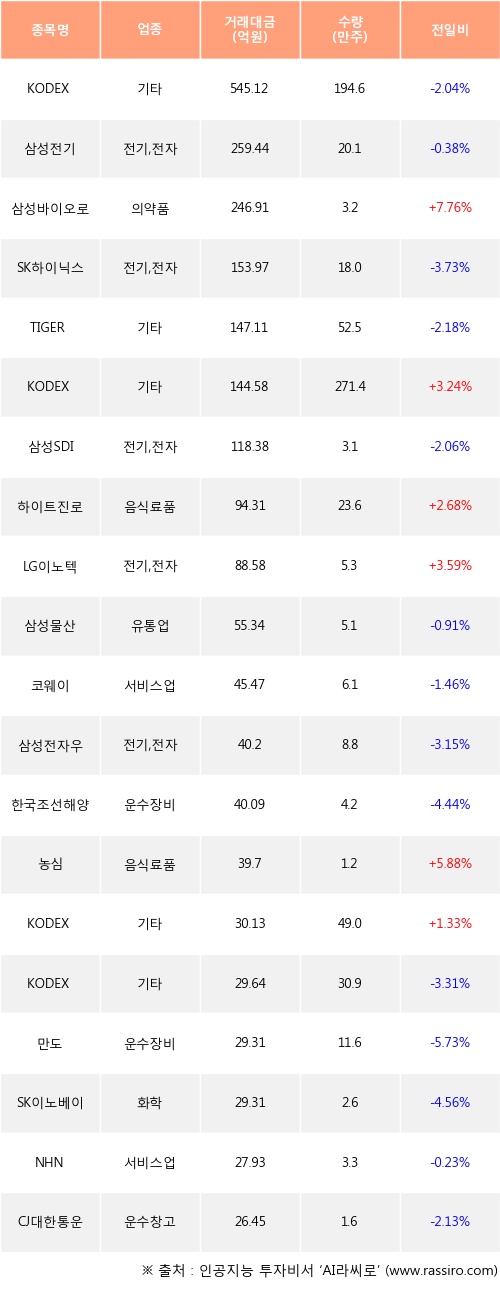 삼성바이오로직스, KODEX 200선물인버스2X, 하이트진로 등은 전일 대비 주가가 상승했고, KODEX 200, 삼성전기, SK하이닉스 등은 주가가 하락했다.