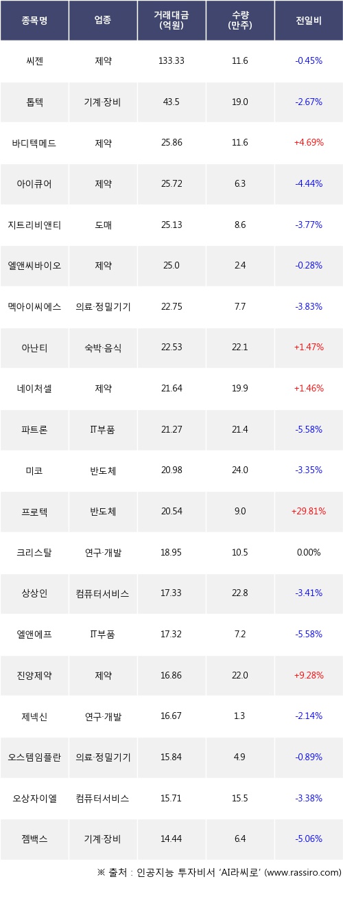 바디텍메드, 아난티, 네이처셀 등은 전일 대비 주가가 상승했고, 씨젠, 톱텍, 아이큐어 등은 주가가 하락했다.