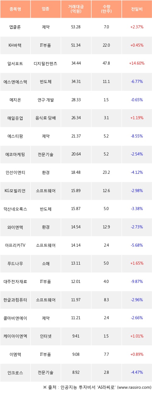 앱클론, KH바텍, 알서포트 등은 전일 대비 주가가 상승했고, 에스앤에스텍, 메지온, 에스티팜 등은 주가가 하락했다.