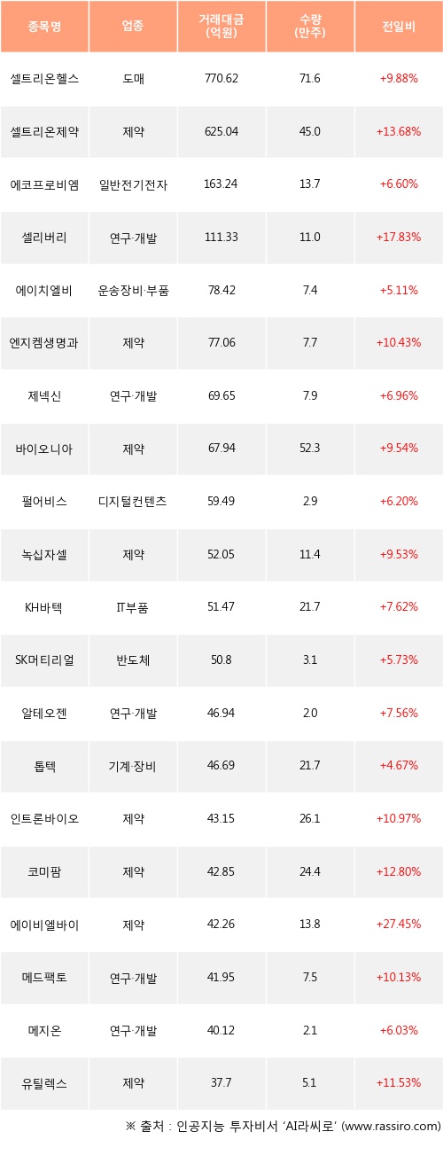 외국인 투자자의 순매수 상위 20개 종목은 셀트리온헬스케어, 셀트리온제약, 에코프로비엠, 셀리버리, 에이치엘비, 엔지켐생명과학, 제넥신, 바이오니아, 펄어비스, 녹십자셀등이다.