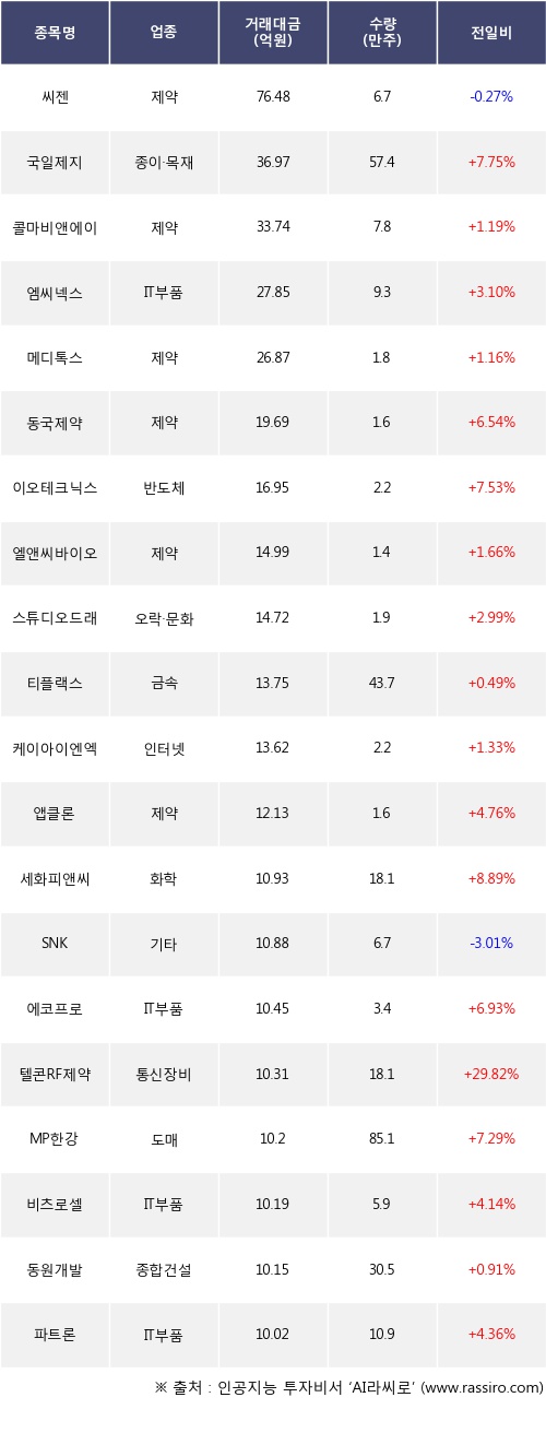 국일제지, 콜마비앤에이치, 엠씨넥스 등은 전일 대비 주가가 상승했고, 씨젠, SNK 등은 주가가 하락했다.