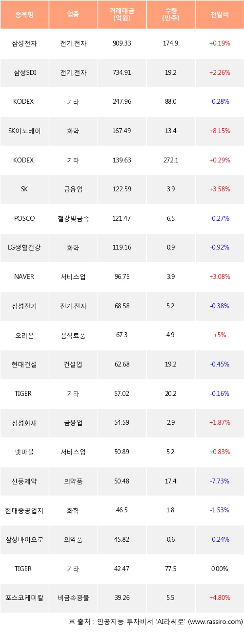 외국인 투자자의 순매수 상위 20개 종목은 삼성전자, 삼성SDI, KODEX 200, SK이노베이션, KODEX 200선물인버스2X, SK, POSCO, LG생활건강, NAVER, 삼성전기등이다.