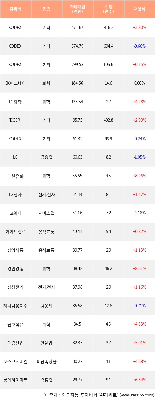 KODEX WTI원유선물(H), KODEX 200, LG화학 등은 전일 대비 주가가 상승했고, KODEX 200선물인버스2X, KODEX 인버스, LG 등은 주가가 하락했다.