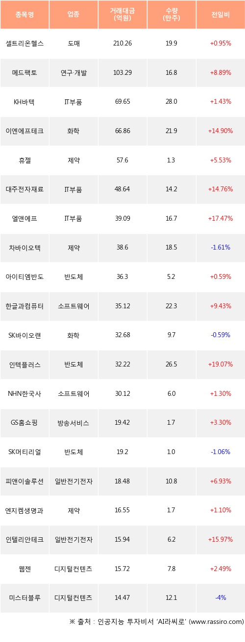 셀트리온헬스케어, 메드팩토, KH바텍 등은 전일 대비 주가가 상승했고, 차바이오텍, SK바이오랜드, SK머티리얼즈 등은 주가가 하락했다.