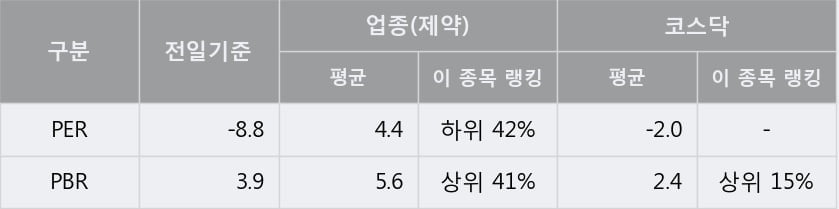 당기순이익 적자로 인해 이 종목의 PER는 마이너스이고, PBR은 3.9배이다. PER는 마이너스라서 제약업종의 평균 PER 4.4배 대비 -13.2배 낮은 수준이고, PBR은 제약업종의 평균 PBR 5.6배 대비 -1.7배 낮은 수준으로 업종 내에서 상위 41%에 위치한다.