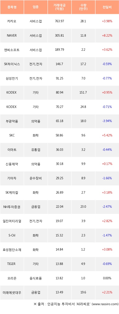 카카오, NAVER, 엔씨소프트 등은 전일 대비 주가가 상승했고, SK하이닉스, 삼성전기, KODEX 200 등은 주가가 하락했다.