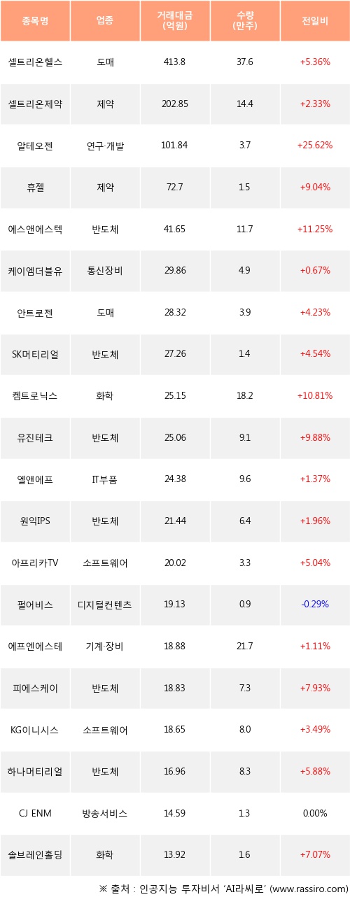 셀트리온헬스케어, 셀트리온제약, 알테오젠 등은 전일 대비 주가가 상승했고, 펄어비스 등은 주가가 하락했다.
