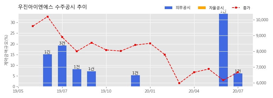 계약 상대방은 (주)포스코건설이고, 계약금액은 65.4억원 규모로 최근 우진아이엔에스 매출액 1,073.1억원 대비 약 6.09% 수준이다. 이번 계약의 기간은 2020년 07월 13일 부터 2021년 06월 30일까지로 약 11개월이다.