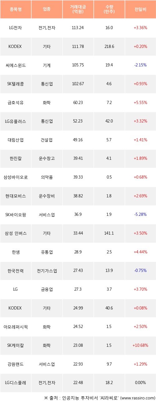 LG전자, KODEX 200선물인버스2X, SK텔레콤 등은 전일 대비 주가가 상승했고, 씨에스윈드, SK바이오팜, 한국전력 등은 주가가 하락했다.