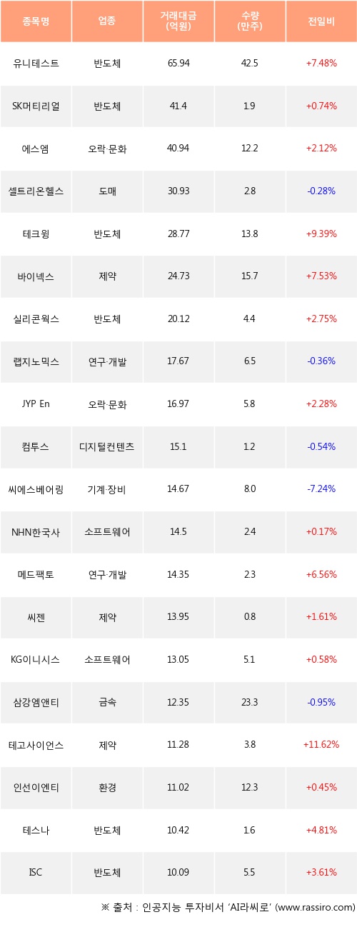 기관 투자자의 순매수 상위 20개 종목은 유니테스트, SK머티리얼즈, 에스엠, 셀트리온헬스케어, 테크윙, 바이넥스, 실리콘웍스, 랩지노믹스, JYP Ent., 컴투스등이다.