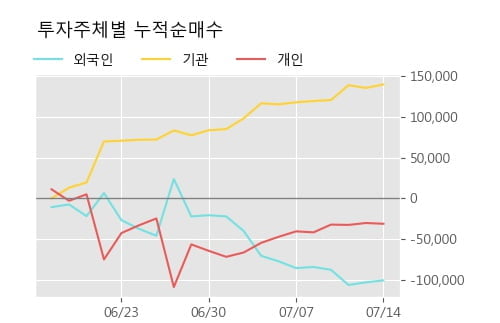 지난 한달을 기준으로 보면 기관이 14.0만주를 순매수한 반면, 외국인은 10.5만주를 순매도했고, 개인들도 3.0만주를 순매도했다. 같은 기간 이 종목의 거래비중은 외국인과 개인이 각각 12.4%, 84.4%로 비중이 높다.