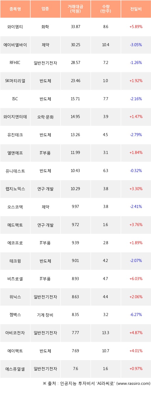 와이엠티, SK머티리얼즈, 와이지엔터테인먼트 등은 전일 대비 주가가 상승했고, 에이비엘바이오, RFHIC, ISC 등은 주가가 하락했다.