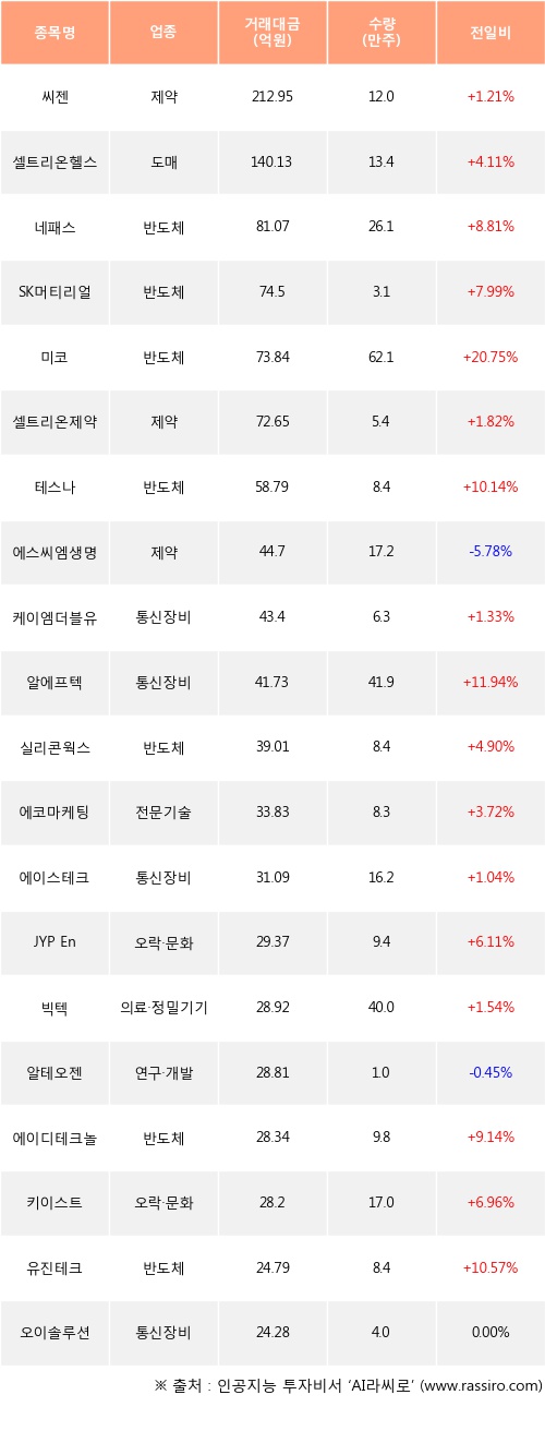 외국인 투자자의 순매수 상위 20개 종목은 씨젠, 셀트리온헬스케어, 네패스, SK머티리얼즈, 미코, 셀트리온제약, 테스나, 에스씨엠생명과학, 케이엠더블유, 알에프텍등이다.