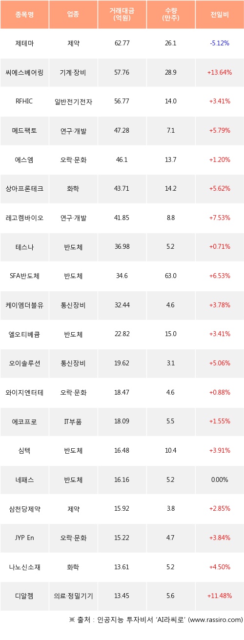 씨에스베어링, RFHIC, 메드팩토 등은 전일 대비 주가가 상승했고, 제테마 등은 주가가 하락했다.