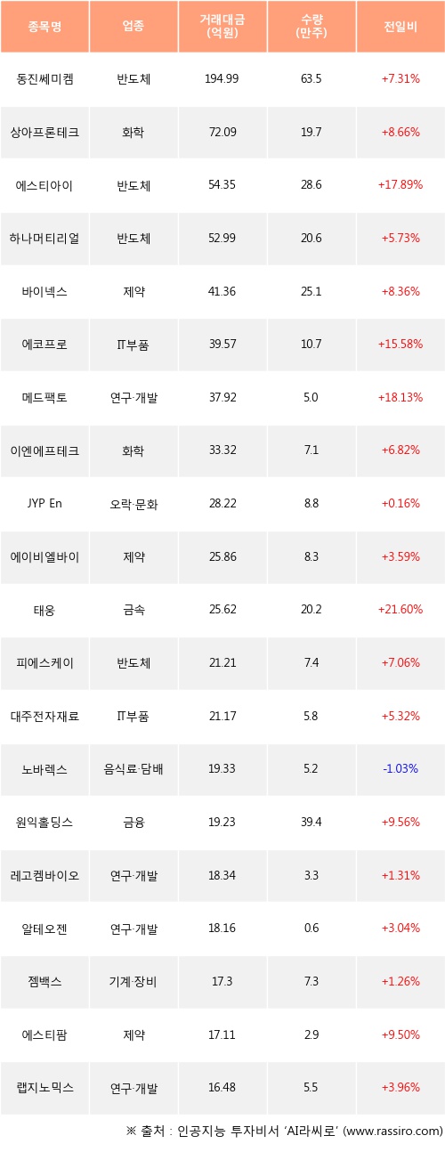 기관 투자자의 순매수 상위 20개 종목은 동진쎄미켐, 상아프론테크, 에스티아이, 하나머티리얼즈, 바이넥스, 에코프로, 메드팩토, 이엔에프테크놀로지, JYP Ent., 에이비엘바이오등이다.