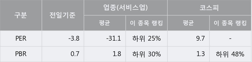 당기순이익 적자로 인해 이 종목의 PER는 마이너스이고, PBR은 0.7배이다. PER는 마이너스라서 서비스업업종의 평균 PER -31.1배 대비 +27.3배 높은 수준이고, PBR은 서비스업업종의 평균 PBR 1.8배 대비 -1.1배 낮은 수준으로 업종 내에서 하위 30%에 위치한다.