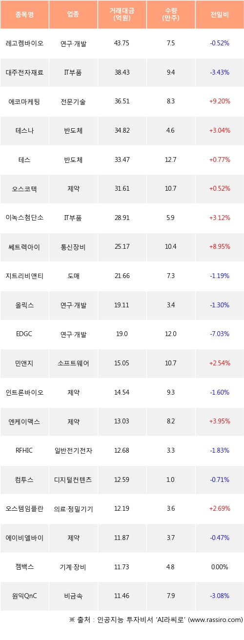 에코마케팅, 테스나, 테스 등은 전일 대비 주가가 상승했고, 레고켐바이오, 대주전자재료, 지트리비앤티 등은 주가가 하락했다.