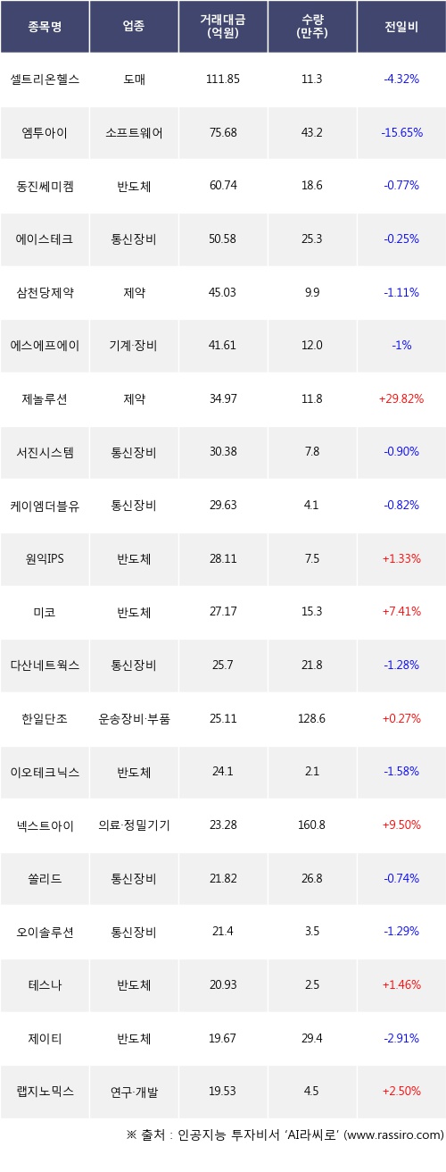 제놀루션, 원익IPS, 미코 등은 전일 대비 주가가 상승했고, 셀트리온헬스케어, 엠투아이, 동진쎄미켐 등은 주가가 하락했다.