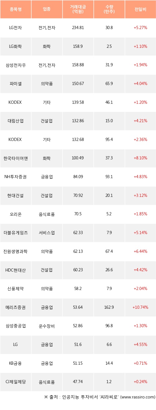 외국인 투자자의 순매수 상위 20개 종목은 LG전자, LG화학, 삼성전자우, 파미셀, KODEX 200, 대림산업, KODEX 레버리지, 한국타이어앤테크놀로지, NH투자증권, 현대건설등이다.