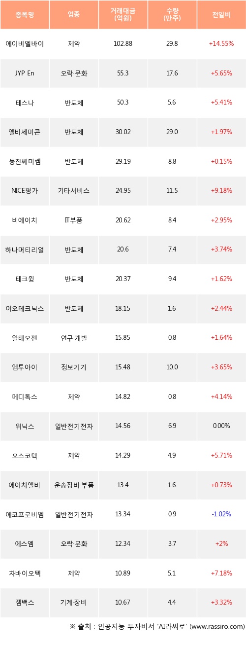 에이비엘바이오, JYP Ent., 테스나 등은 전일 대비 주가가 상승했고, 에코프로비엠 등은 주가가 하락했다.